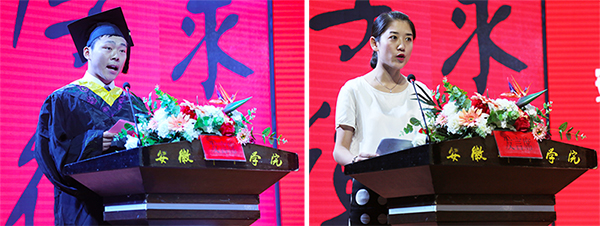 儀式上,畢業(yè)生代表劉錄洋回顧了四年大學(xué)生活的點(diǎn)滴回憶,表達(dá)了對(duì)母校培育之恩的無限感激和對(duì)這片知識(shí)沃土的眷戀之情,表示將通過一點(diǎn)一滴的積累奮斗,努力開創(chuàng)更加美好的未來。教師代表董甜甜向畢業(yè)生們表示祝賀,她肯定了同學(xué)們四年的成長,向全體畢業(yè)生提出了殷切期望,并送上了飽含深情的叮囑和希冀。