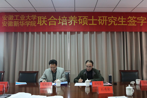 鄭明東在講話中表示,此次簽約儀式將是兩校加強合作的良好開端,希望兩校在課程建設、專業建設、學科建設等方面開展更加緊密的合作。江貴生在講話中指出,安徽新華學院近年來在教育改革、人才培養、科學研究等方面取得了優異的成績,可喜可賀。此次與安徽工業大學聯合培養碩士研究生,代表著安徽新華學院在辦學質量和辦學水平上又邁出了一大步。他希望兩校在更廣的領域開展學科建設和研究生教育合作,共同推進兩校又好又快發展,實現互惠共贏。